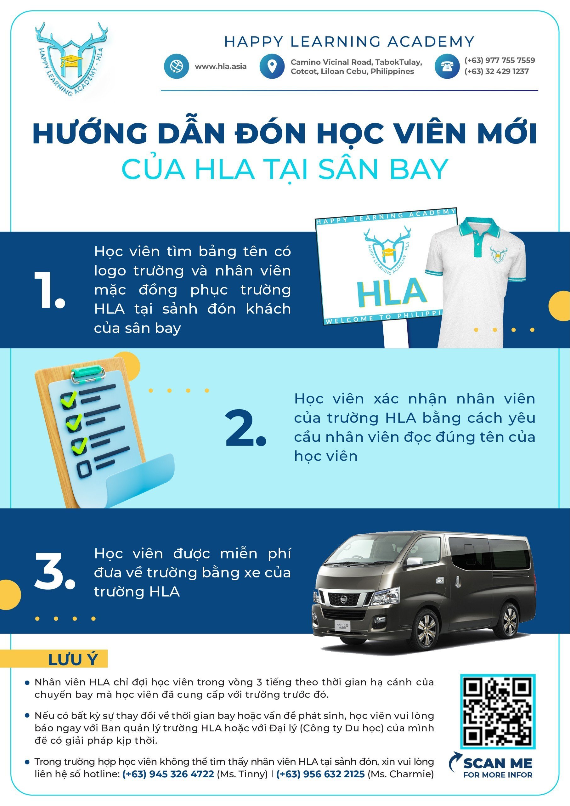 Ngoài Phiếu thông tin xác nhận đón học viên tại sân bay mà HLA gửi đến học viên sau khi hoàn tất đóng học phí, bao gồm thông tin và số điện thoại liên lạc của nhân viên đón học viên hôm ấy, HLA còn cung cấp thêm các số hotline nhằm hỗ trợ học viên trong trường hợp khẩn cấp. HLA rất mong học viên sẽ có những trải nghiệm đẹp trong quá trình học tại trường và đất nước xinh đẹp Philippines này.