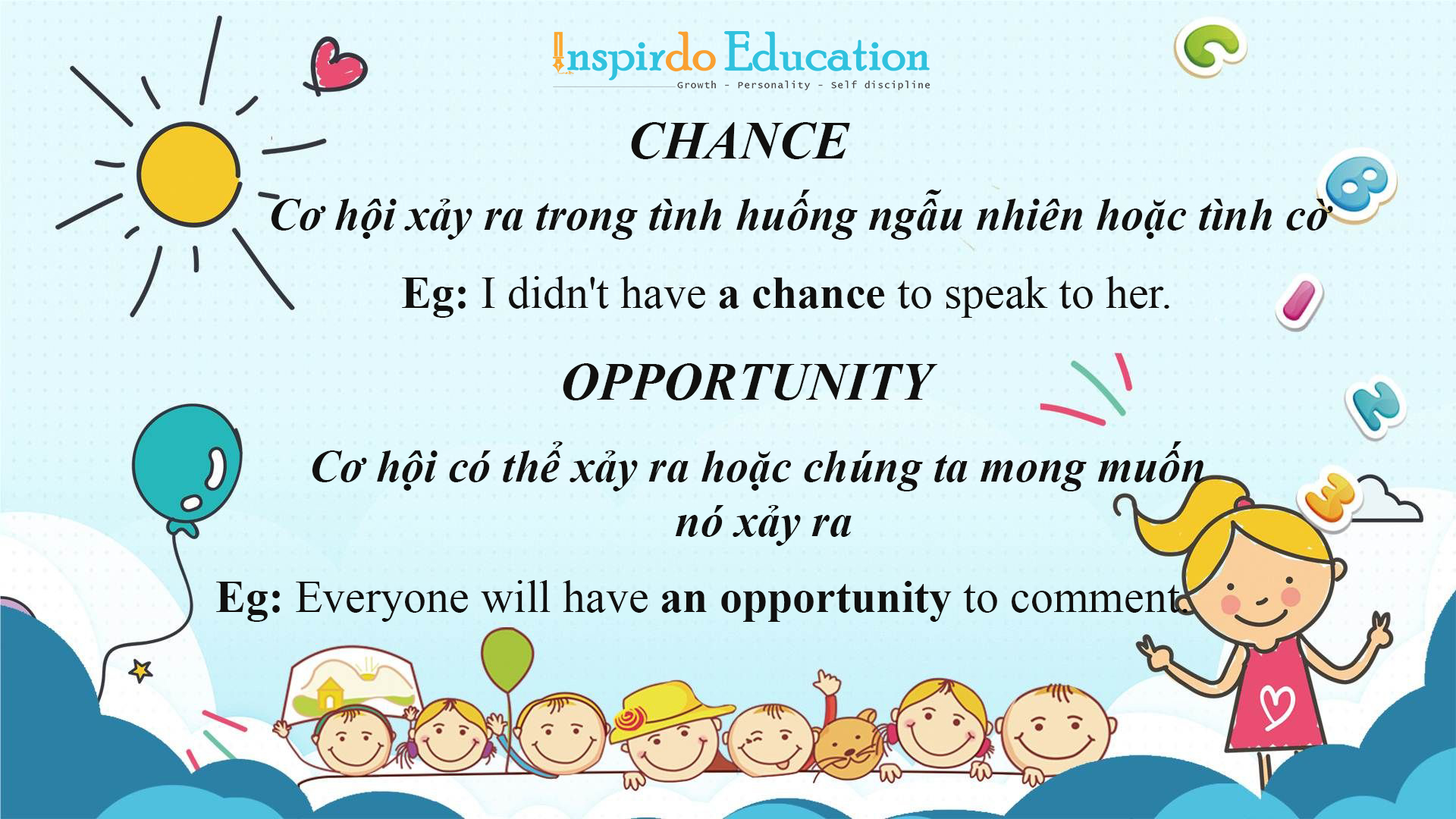 Chance và Opportunity đều có nghĩa là “Cơ hội”. Tuy nhiên, hàm ý “Cơ hội” giữa 2 từ vựng này lại mang ý nghĩa khác nhau mà khi sử dụng mà các bạn cần lưu ý.
