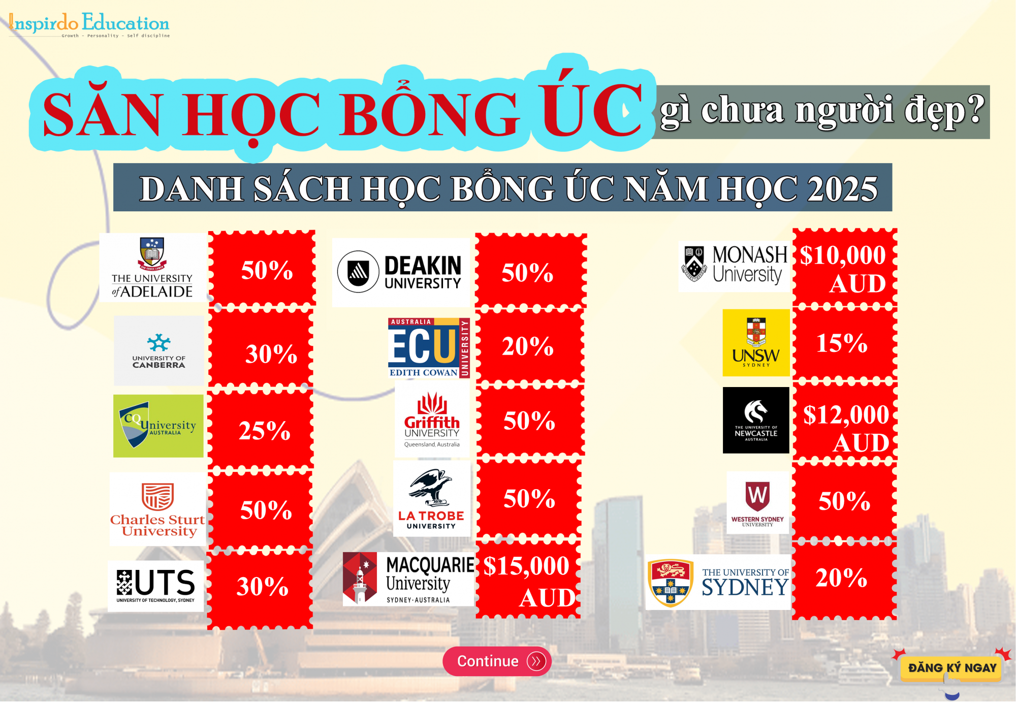 Có thể nói Úc là một trong những quốc gia có sự ưu ái nhất với du học sinh quốc tế vì luôn duy trì quỹ học bổng đa dạng và cực khủng hàng năm. Tuy nhiên để săn học bổng du học Úc thành công cũng không phải là việc dễ dàng. Các em cần có sự chuẩn bị lâu dài về mặt học thuật, ngôn ngữ, hồ sơ cá nhân,.. Cùng Inspirdo Edu tìm hiểu các trường Đại học tại Úc hiện đang có học bổng lớn cho năm học 2025 và nhanh chóng chuẩn bị hồ sơ cho kịp săn thành công những học bổng này nhé. ăn học bổng du học Úc 2025 là mối quan tâm đặc biệt của nhiều học sinh, sinh viên.