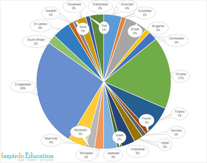Mặc dù là trường tại Singapore và có số lượng đông nhất nhưng tại Insworld, sinh viên bản xứ chỉ chiếm 26% trên tổng số sinh viên. Nếu như những trường khác đa phần là sinh viên đến từ các nước Châu Á như Trung Quốc, Nhật Bản, Indonesia, Ấn Độ… thì với Insworld có đến 15% sinh viên đến các nước phương Tây như Mỹ, Úc, Anh, Đức, Pháp… và chiếm gần bằng tỉ lệ sinh viên Trung Quốc (17%) – điều mà bạn sẽ không thấy tại các trường khác tại Singapore khi sinh viên Trung Quốc và Ấn Độ luôn chiếm ½ hoặc 1/3 sinh viên tại trường. Điều này một lần nữa khẳng định sự đa dạng văn hóa, độ phổ biến và sức hút của trường so với các trường khác ở Singapore và có sức ảnh hưởng vươn tầm thế giới.